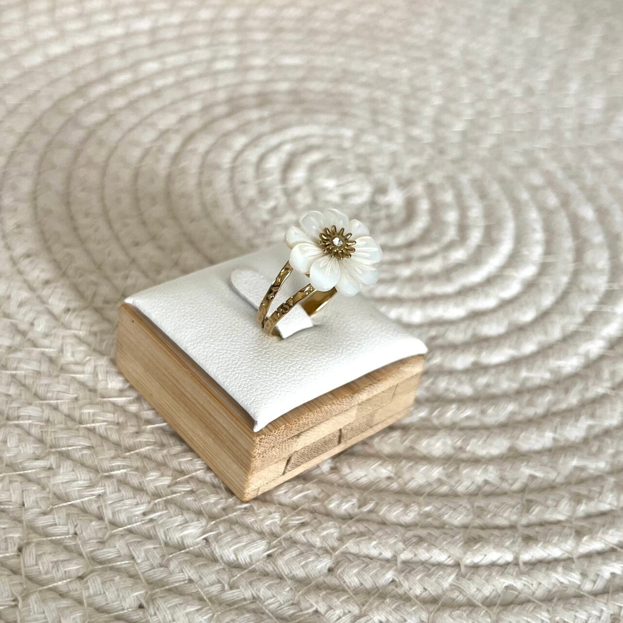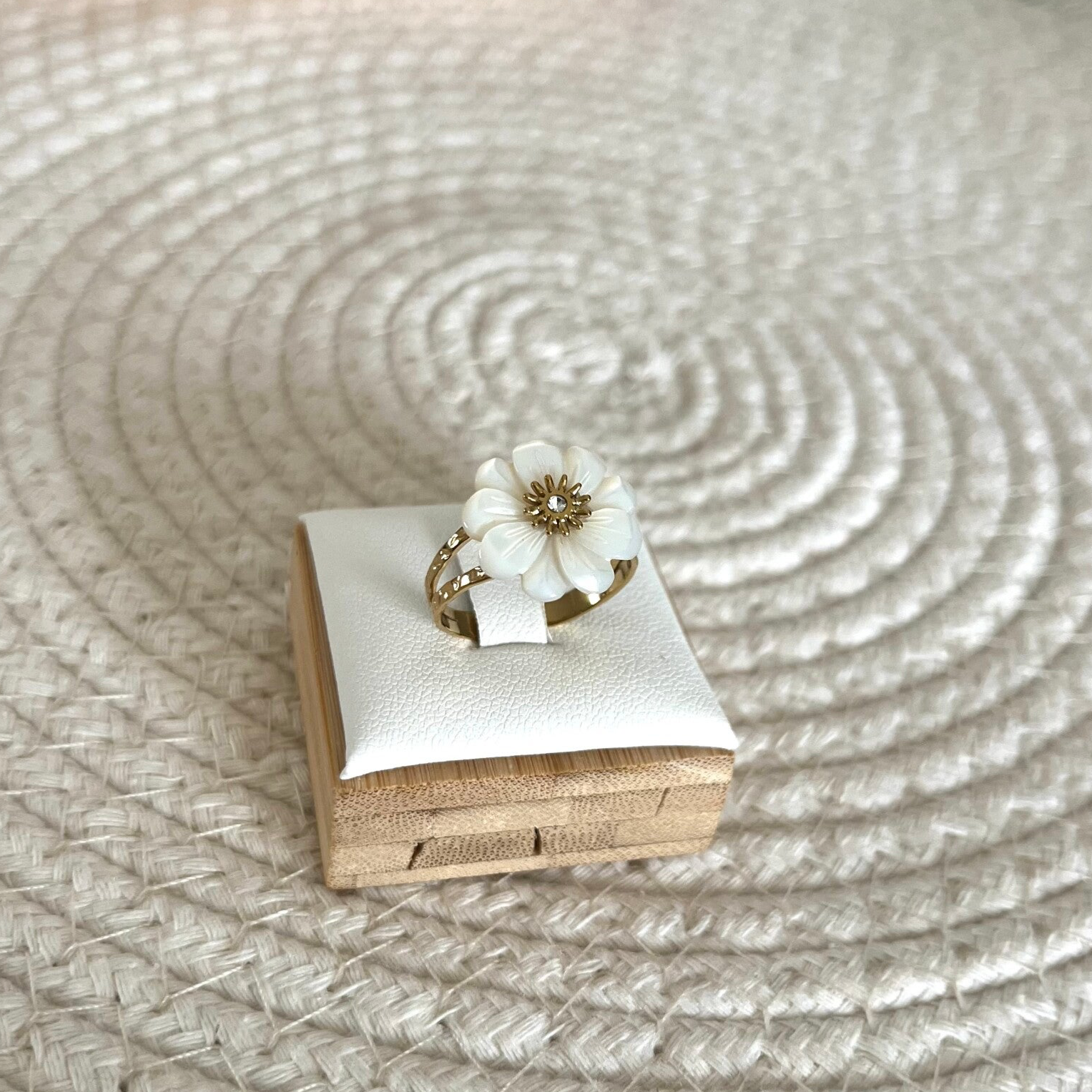 - Bague en acier inoxydable composée d'un anneau martelé en 2 rangs et d'une fleur en pierre naturelle sertie d'un oxyde de zirconium.
