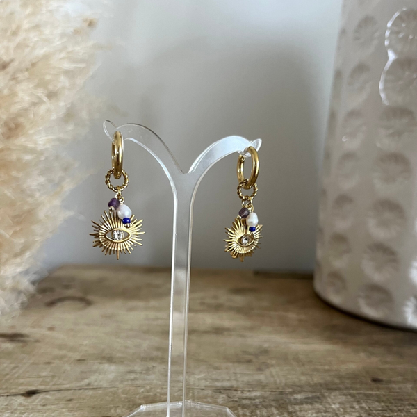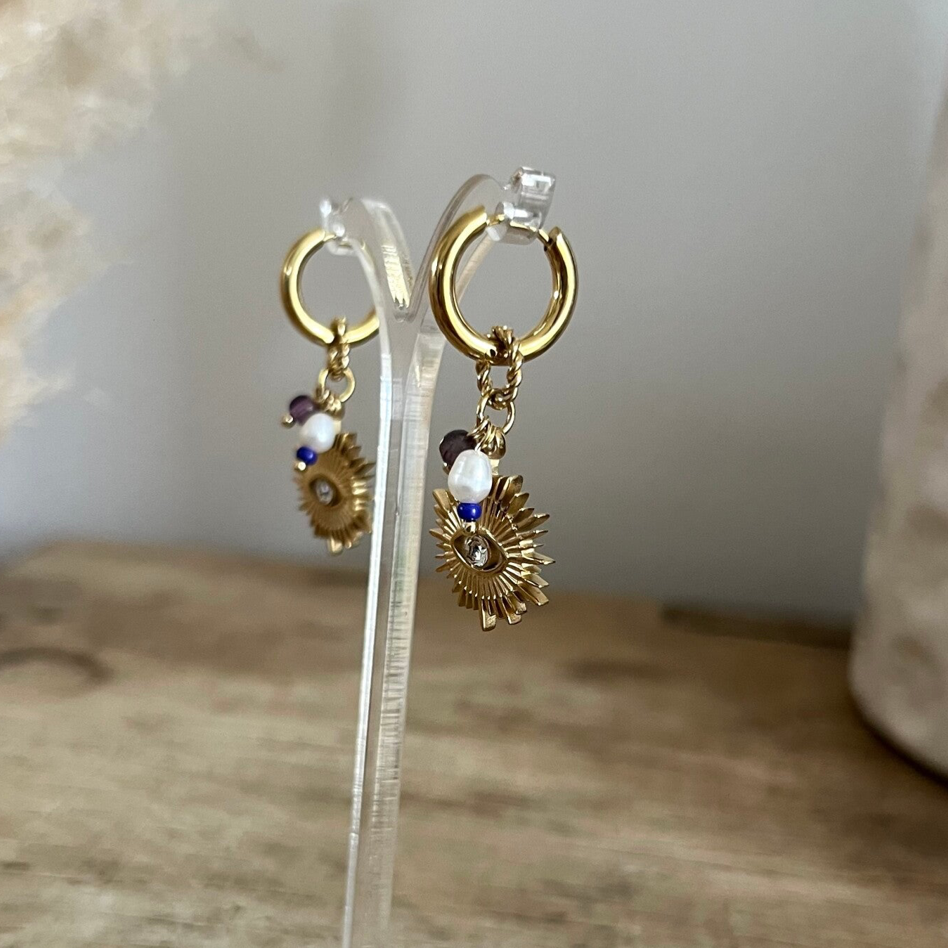 - Boucles d'oreilles type créoles avec fermoir à charnière en acier inoxydable composées d'un oeil serti d'un petit oxyde de zirconium, d'une perle d'eau douce et de pierres naturelles.