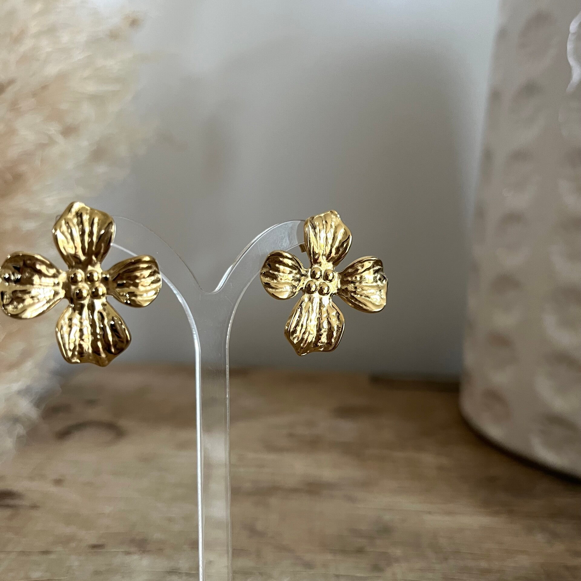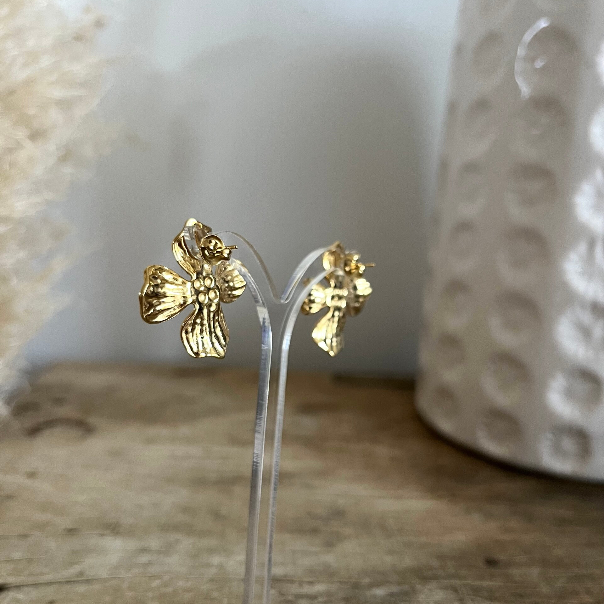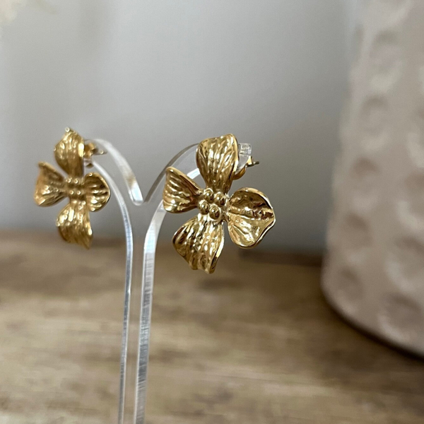 - Boucles d'oreilles à puce en acier inoxydable composées d'une pièce sous la forme d'une fleur texturée.