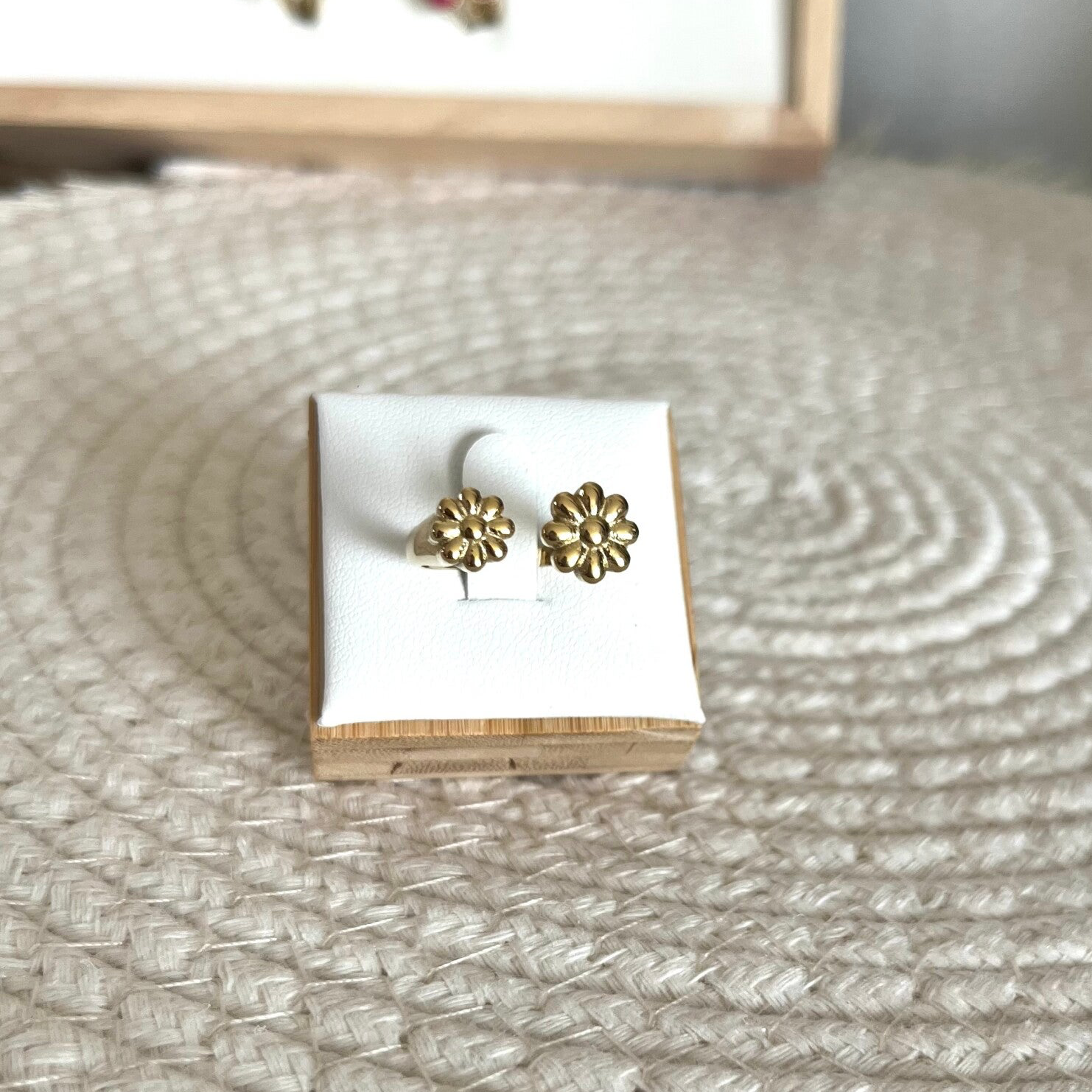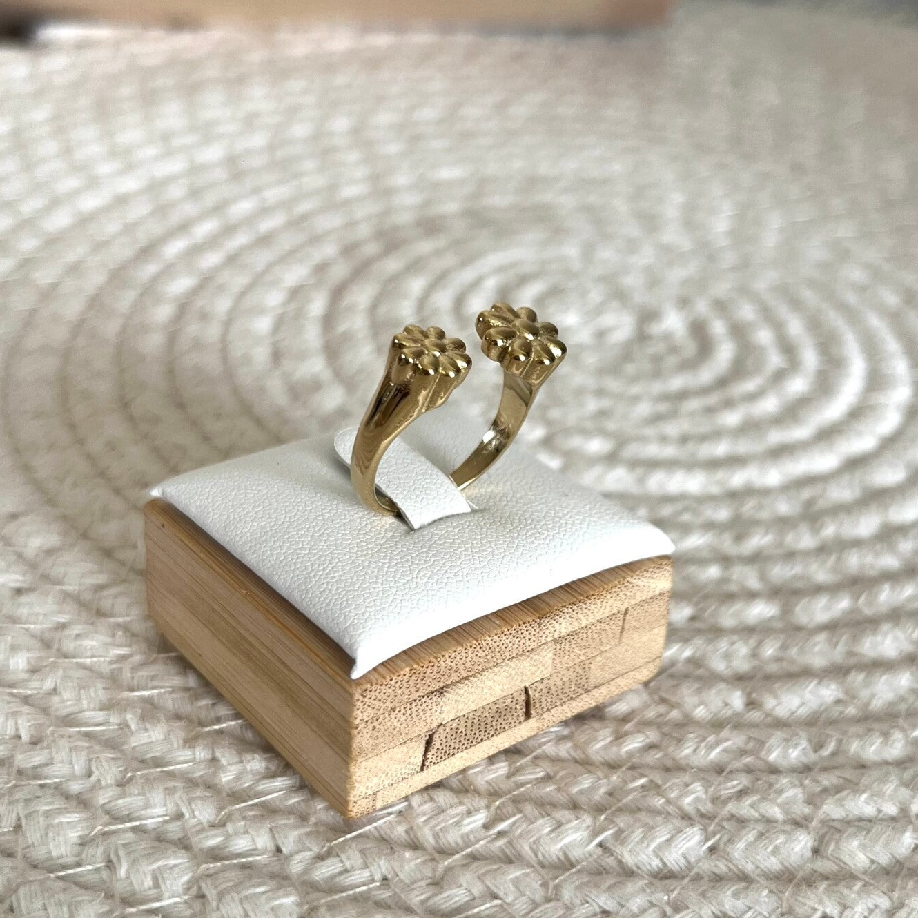 - Bague ouverte en acier inoxydable composée de deux fleurs à chaque extrémité.