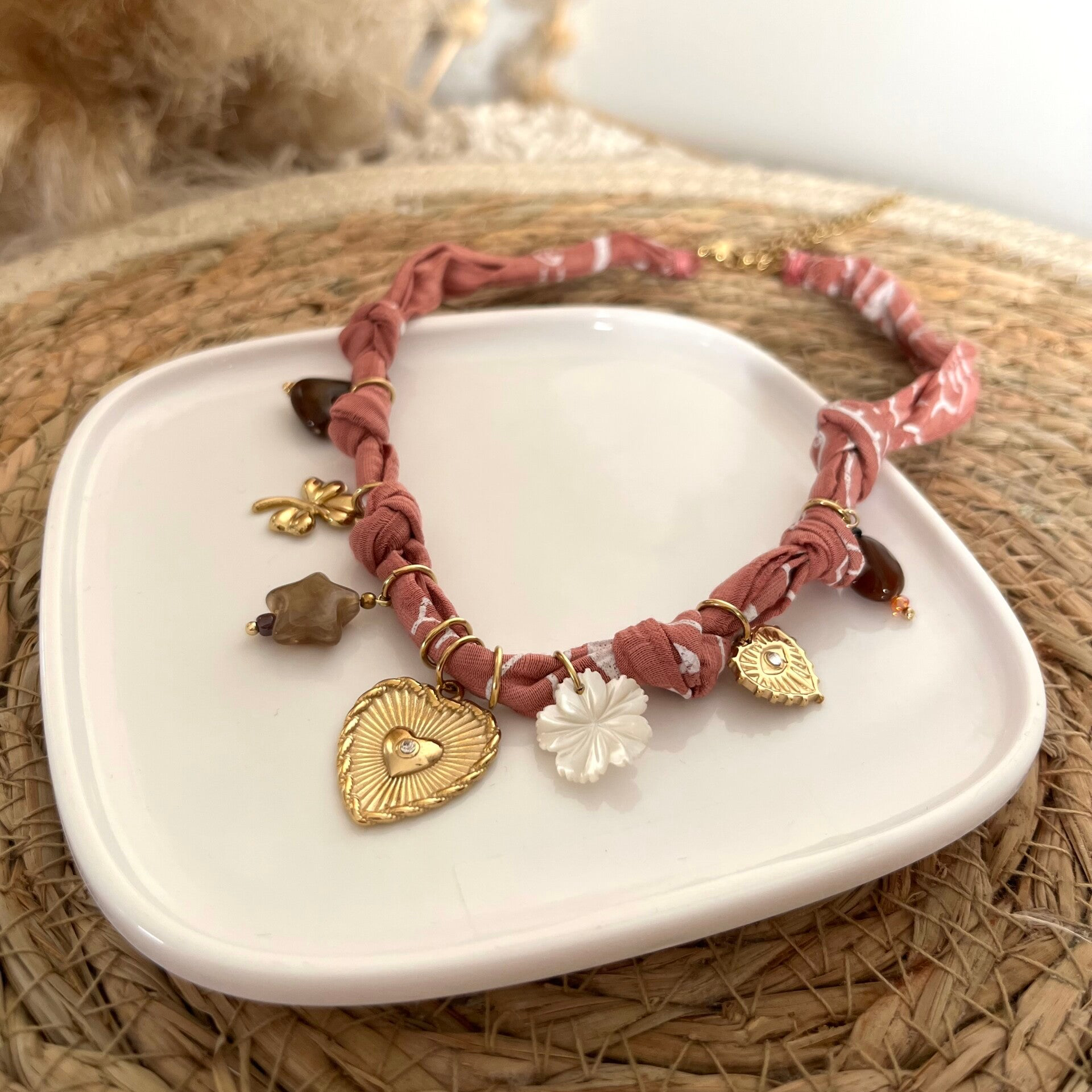 - Collier composé d'un tissu aux motifs uniques, tressé avec une chaîne en acier inoxydable et embelli par des breloques (trèfle, coeurs, étoile, résine, fleur nacrée).