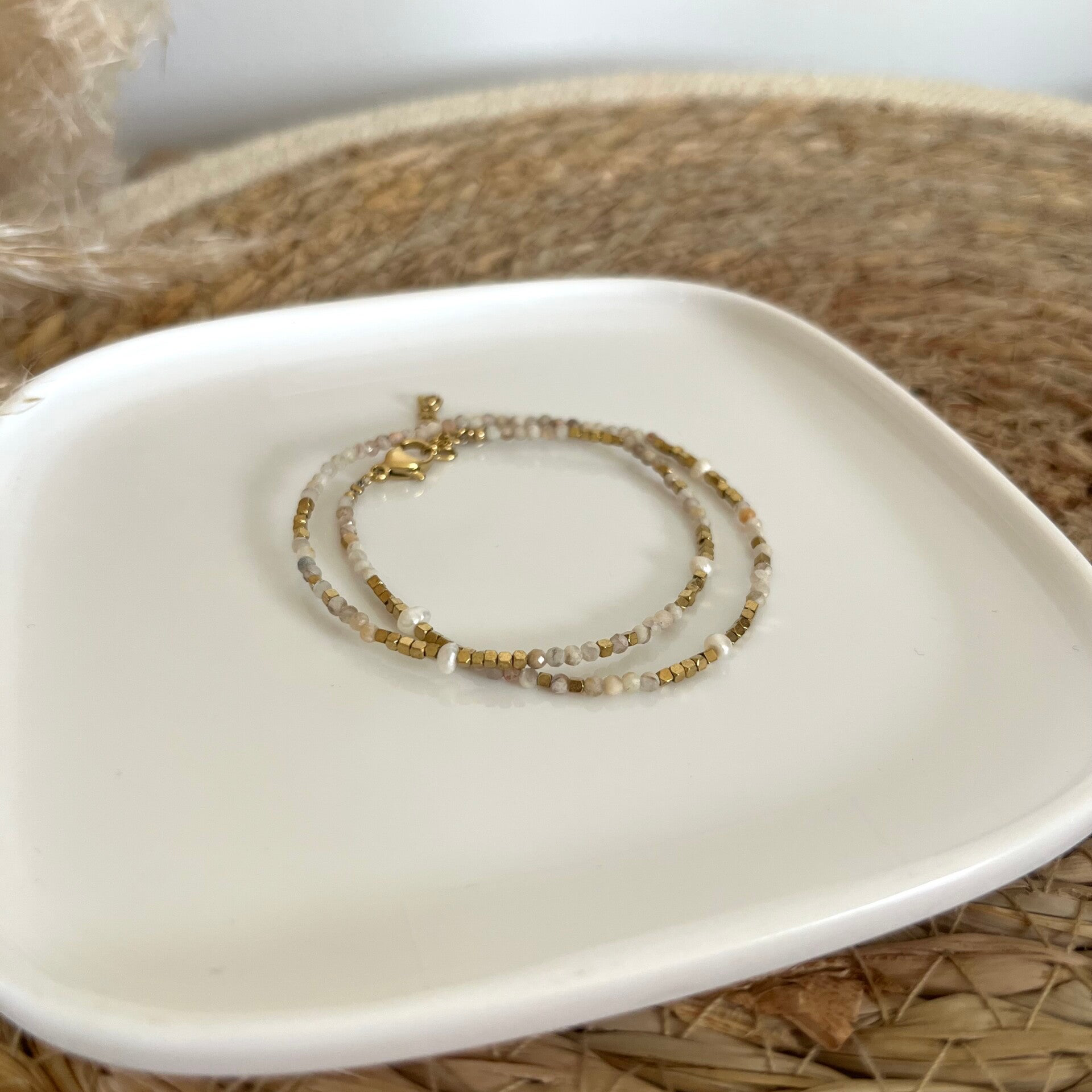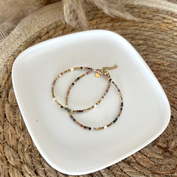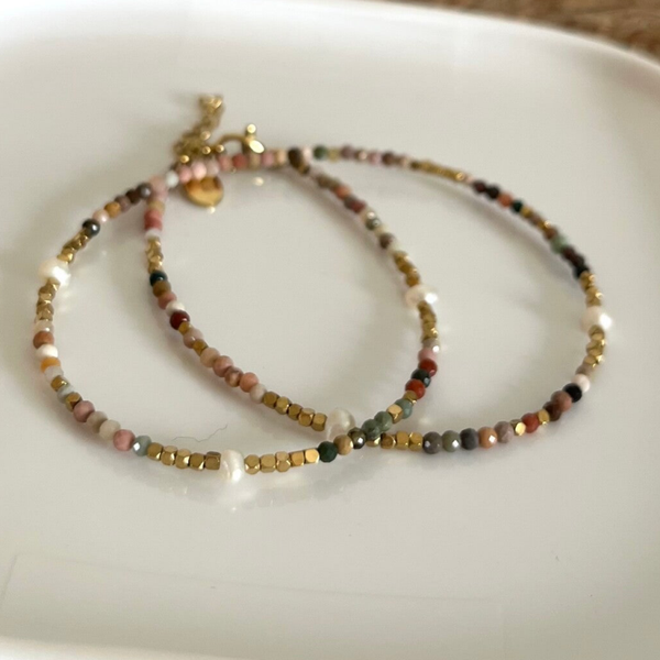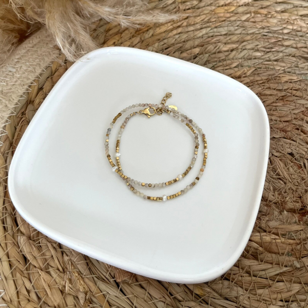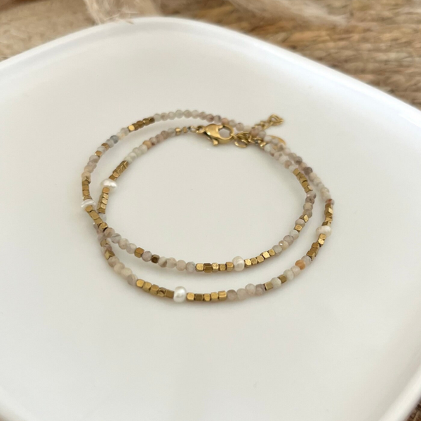 - Bracelet 2 tours sur fil orné de pierres naturelles, de perles d'eau douce et de perles en acier inoxydable.