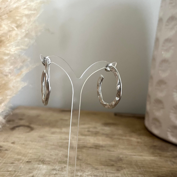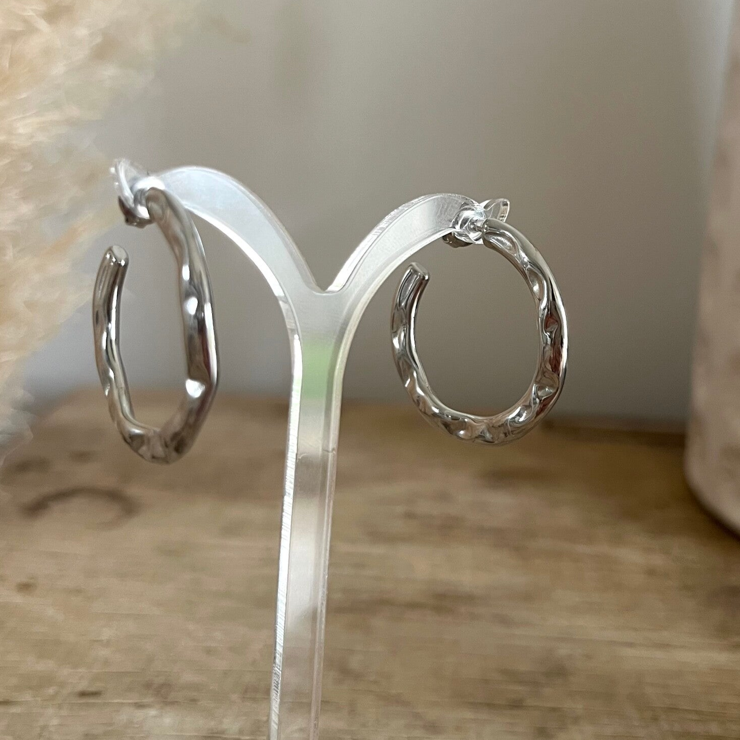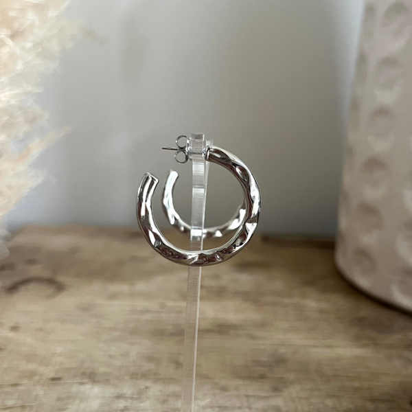 - Boucles d'oreilles type créoles en acier inoxydable composées d'un demi-anneau martelé.