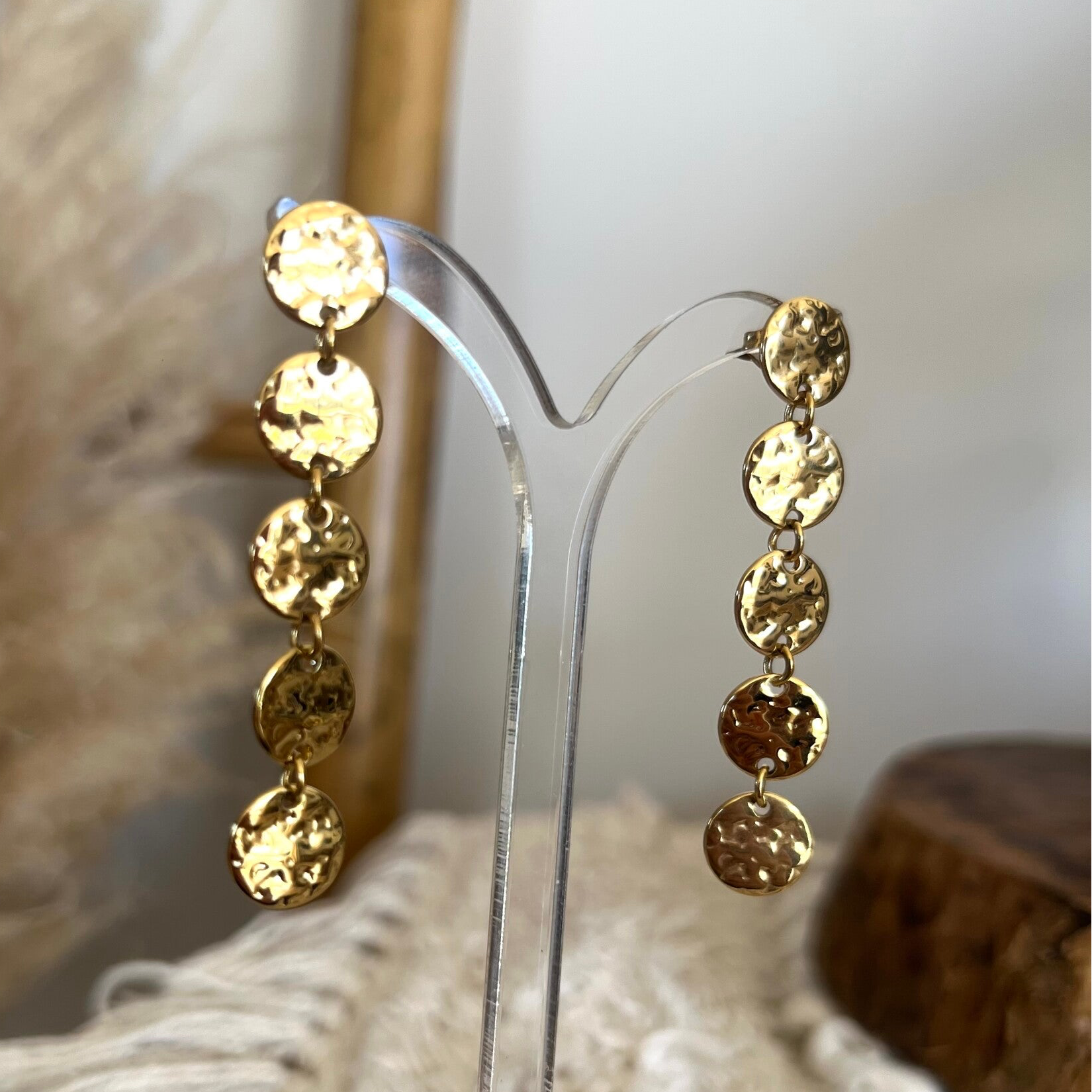 - Boucles d'oreilles pendantes en acier inoxydable composées d'un rang de pièces martelées