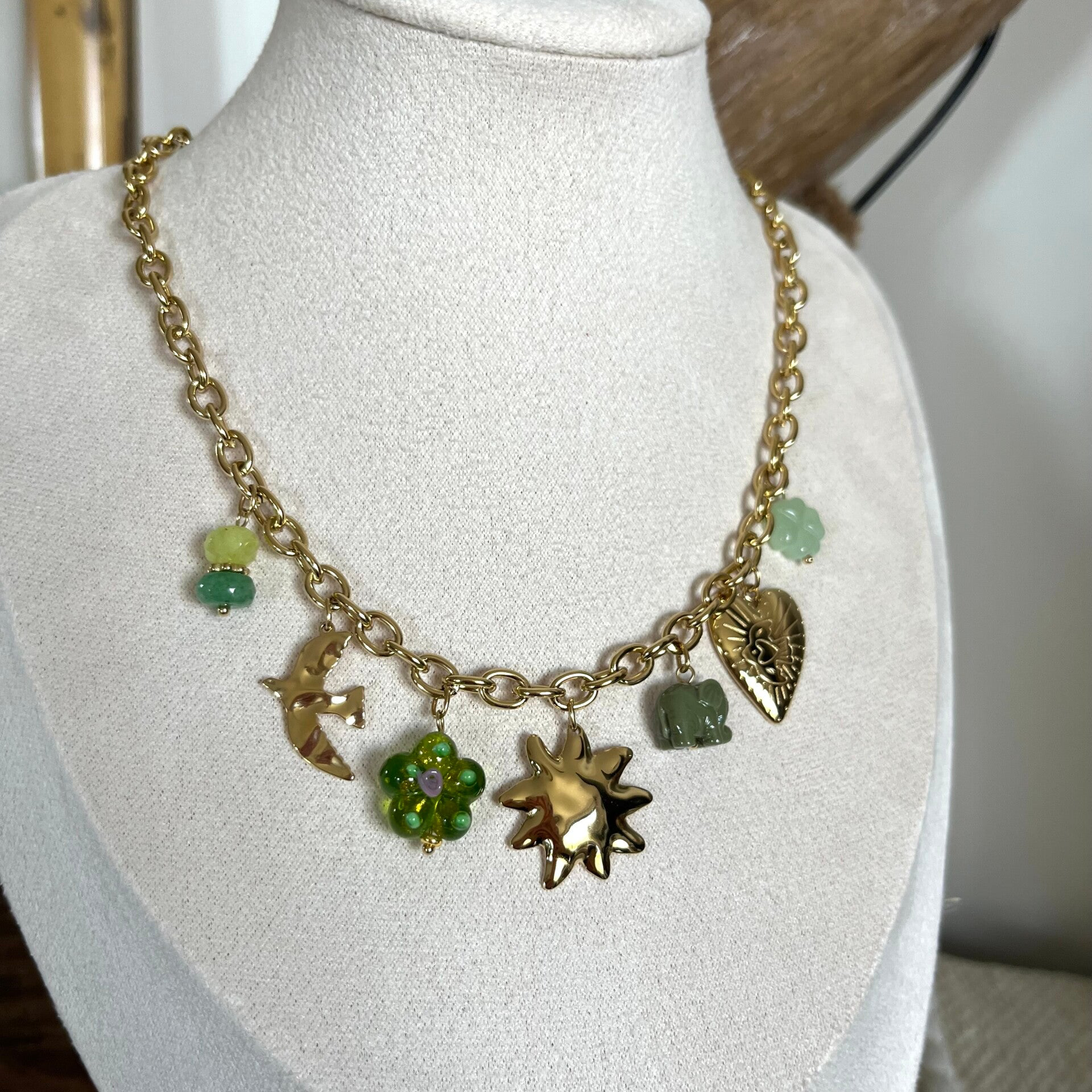 - Collier sur chaîne en acier inoxydable composé de diverses breloques (soleil, fleur, éléphant, coeur, oiseau gravé, trèfle).