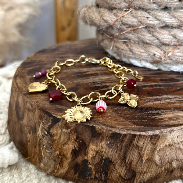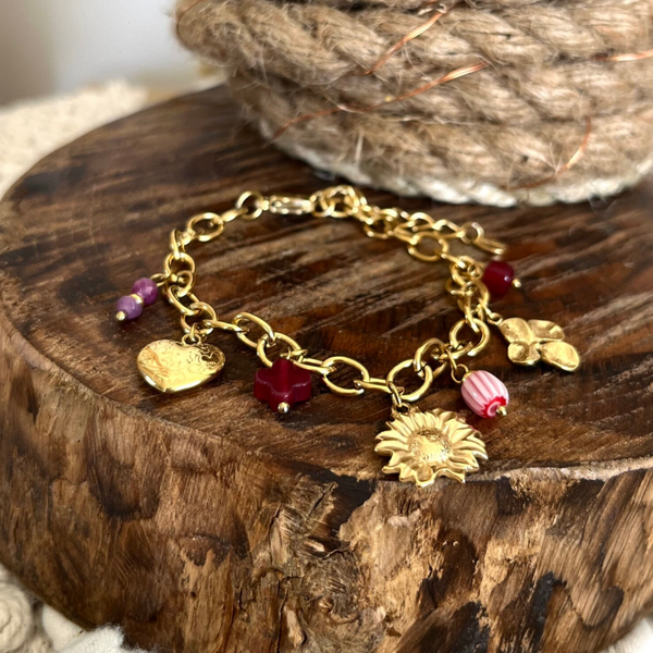 - Bracelet sur chaîne en acier inoxydable composé de divers pendentifs (résine, fleurs, coeur, pierres naturelles, trèfle).