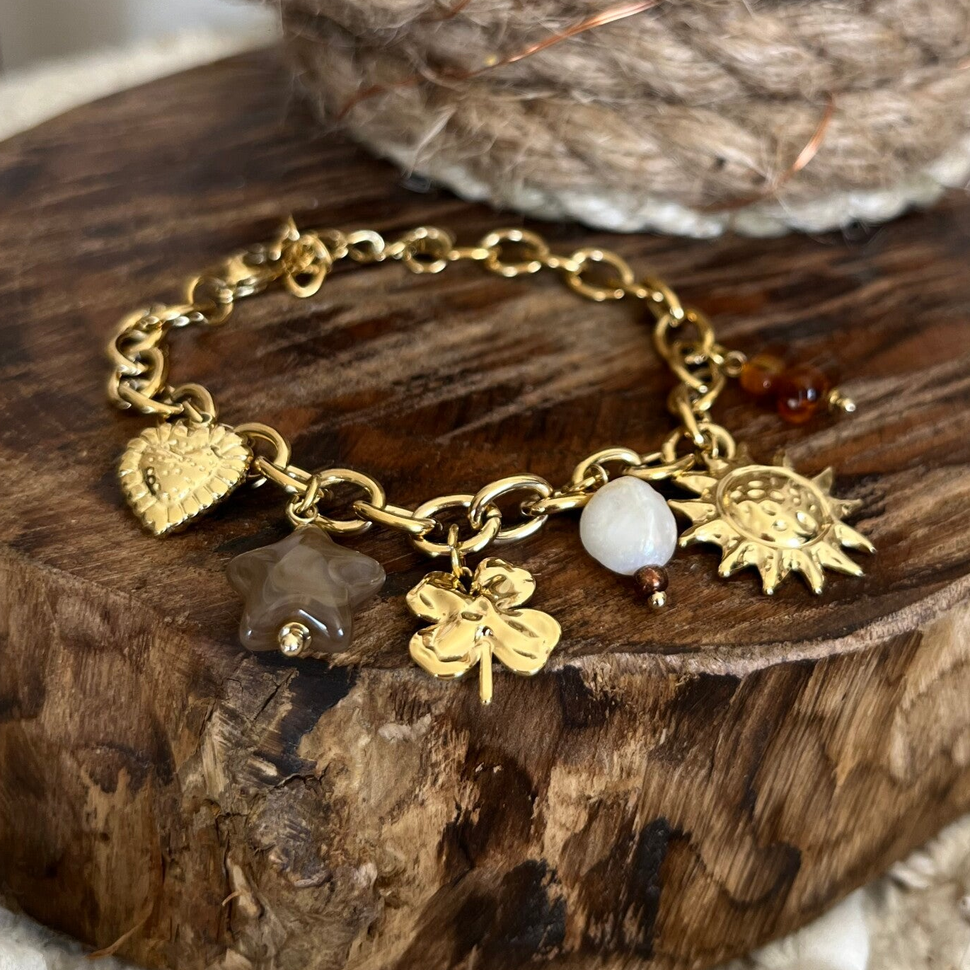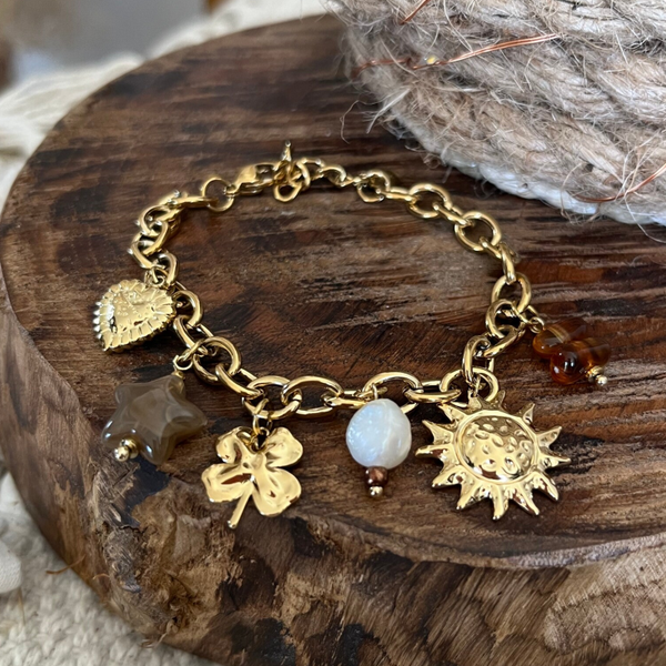 - Bracelet sur chaîne en acier inoxydable composé de divers pendentifs (soleil, perle d'eau douce, trèfle, étoile en résine, coeur).