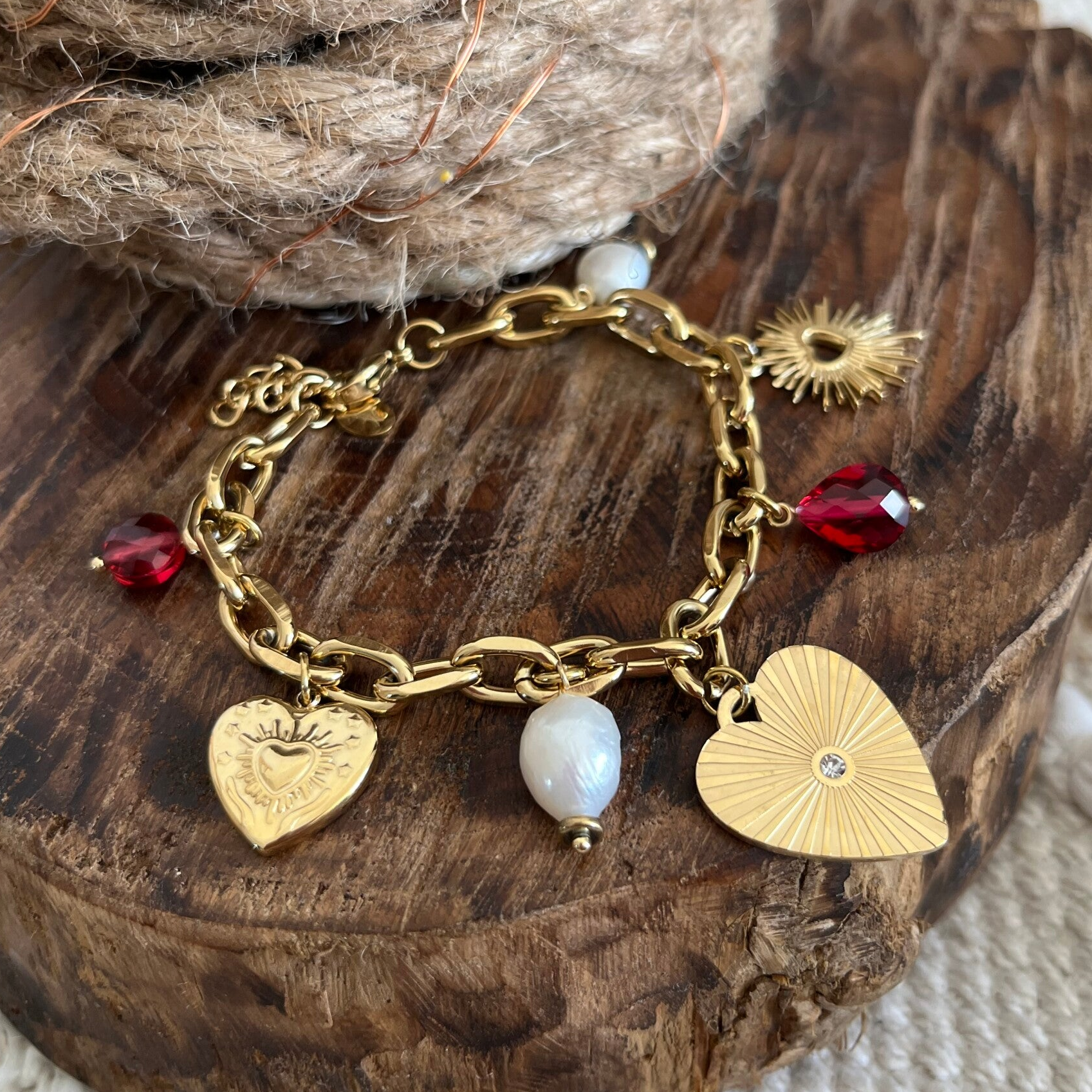 - Bracelet sur chaîne en acier inoxydable composé de breloques coeurs, de perles et de perles d'eau douce.
