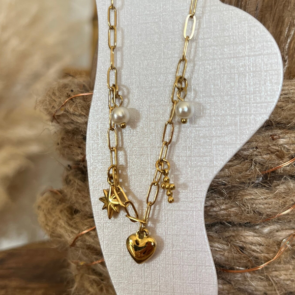 - Composée d’une fine chaîne à maillons allongés. Elle est ornée de breloques comprenant une étoile, un cœur et une petite croix, accompagnées de délicates perles blanches qui apportent une touche lumineuse et féminine.